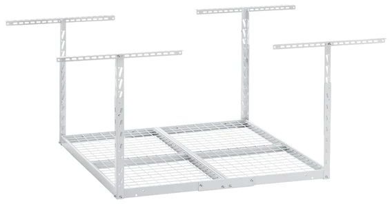 Gladiator® Overhead GearLoft™ Storage Rack adds a new dimension to garage organization. Get a range of items off the floor, from seasonal items and building supplies to full-sized bins and totes. The adjustable height allows for up to 50 cu. ft. of storage, and the rack holds up to 350 lbs of evenly distributed weight. Assembly is quick and hassle-free, thanks to our EZ Connect technology. The heavy duty rack, corrosion resistant hard coat finish, and built-in decking provide durability, while the EZ Connect locking pins hold connection points in place. Covered by Gladiator brand's 10-year limited warranty, you can count on this overhead storage for years to come.Read More